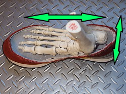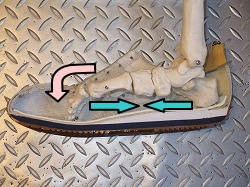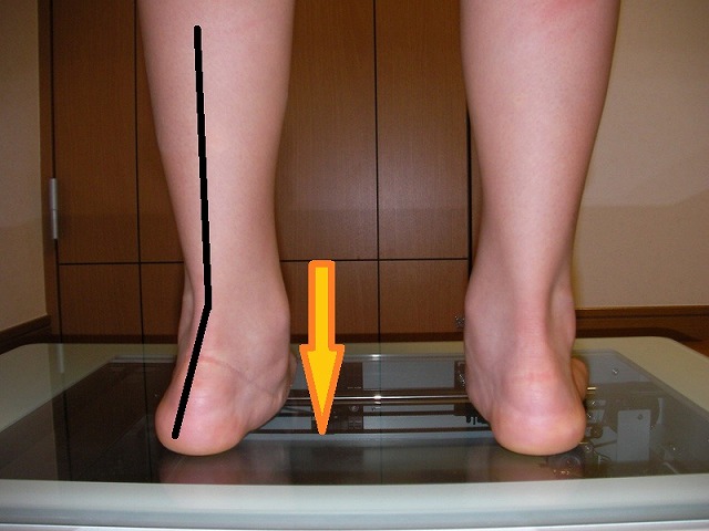 そのため内くるぶしがオレンジ色の矢印で示す下方向への力が働き、その結果、外見的に内側の土踏まずが潰れて扁平足に見える。